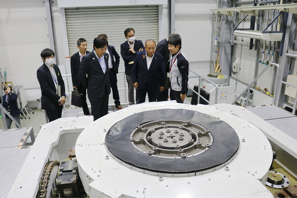 懇談後には、振動試験装置によるデモンストレーションを実施し、市長一行には当社の最新設備と試験技術をご覧いただきました。